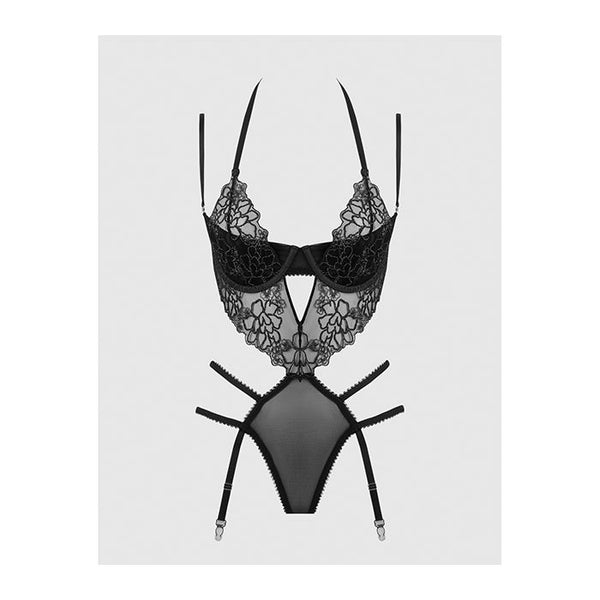 Eden Embroidered Lace & Mesh Teddy with Garters Black