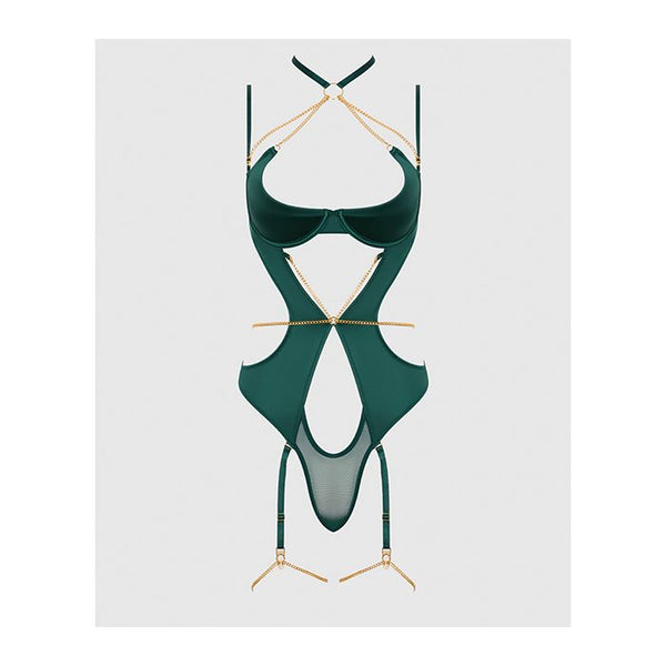 • A dangerously sexy one piece, the Evangeline Satin & Chain Halter Teddy elevates the allure with its dreamy fabric and luxe accents. Sleek liquid satin and mesh envelops your figure while gilded chains wrap across the skin, highlighting the bust, waist, and thighs. Adjustable chains customize to your body for a fit that flatters every figure.