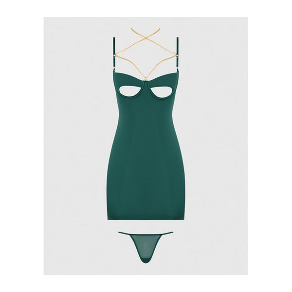 Evangeline Satin & Chain Open Cup & Back Chemise & G-String Set Green