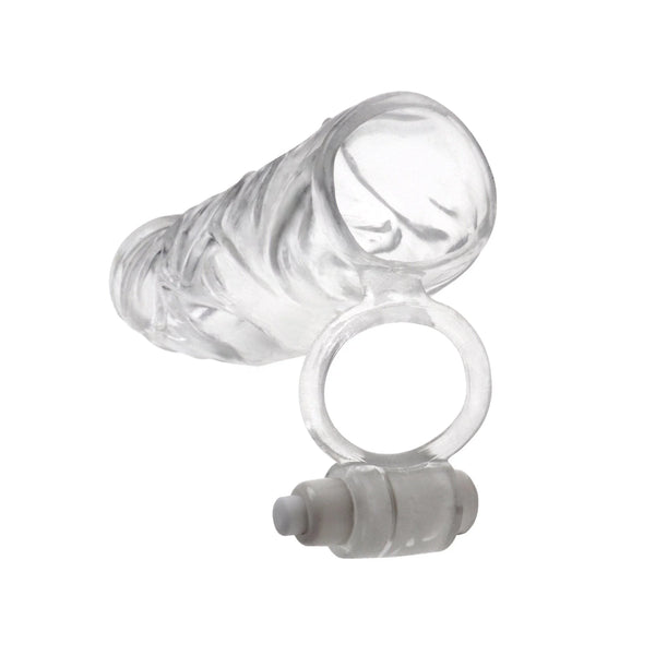 The Vibrating Super Sleeve is a lifelike textured extension that gives you the girth, length, and confidence to satisfy your lover. It is super stretchy to accommodate most sizes and snug enough to help you last longer. The ball strap holds the extension in place, prolongs ejaculation, and features a powerful micro vibe for explosive climaxes. Your partner will enjoy deeper penetration with the 1 inch extension at the tip, while you watch your penis grow bigger and thicker than ever before through the crystal clear sleeve! Try it in the shower or spa and turn bath time into pleasure time! Cleanup is a snap after the fun with the included toy cleaner and warm water. One size fits most. This is extension not a condom.