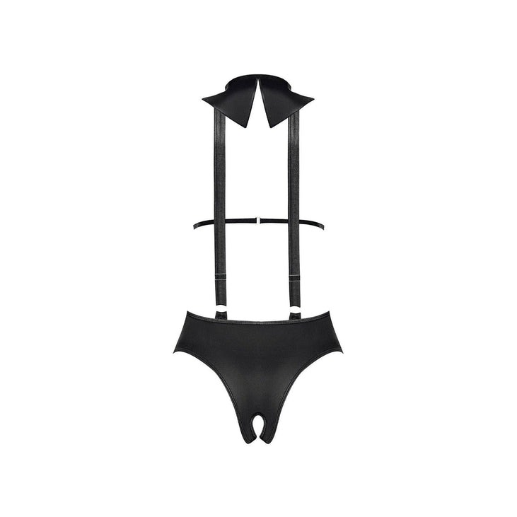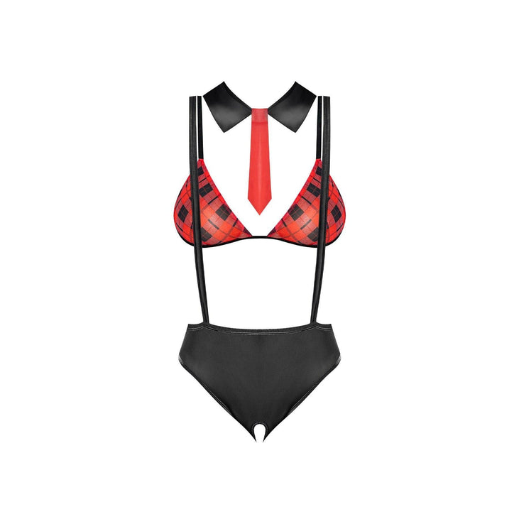 • From the Exposed by Magic Silk Collection, this style includes: a red and black plaid bralette featuring swan-hook closure in the back and adjustable shoulder straps with silver-tone sliders, a black, wet-look, split-crotch panty with attached adjustable suspenders and silver-tone sliders, and a tie collar.