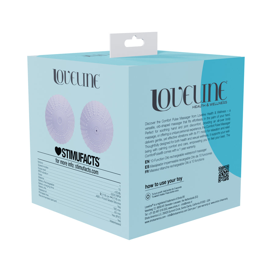 • Discover the Comfort Pulse Massager from Loveline Health & Wellness – a versatile, orb-shaped massager that fits effortlessly in the palm of your hand. Perfect for soothing hand and joint discomfort, providing an all-over body massage, or offering a unique personal experience, the Comfort Pulse Massager delivers gentle, yet effective vibrations with its F1 motor for relaxation and relief. Thoughtfully designed for both health and sexual wellness, it supports your well-being with calming comfort and care, empowering you to feel your best. The ComfortPulse® comes with a 1 year warranty.