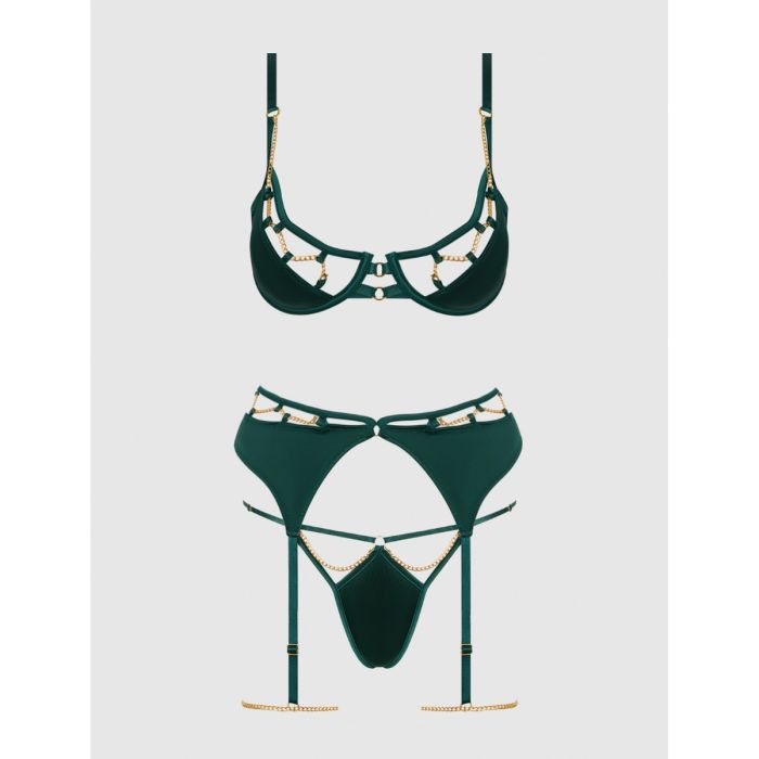 Evangeline Satin & Chain Push Up Bra Thigh Garter Belt & G-String Set Green