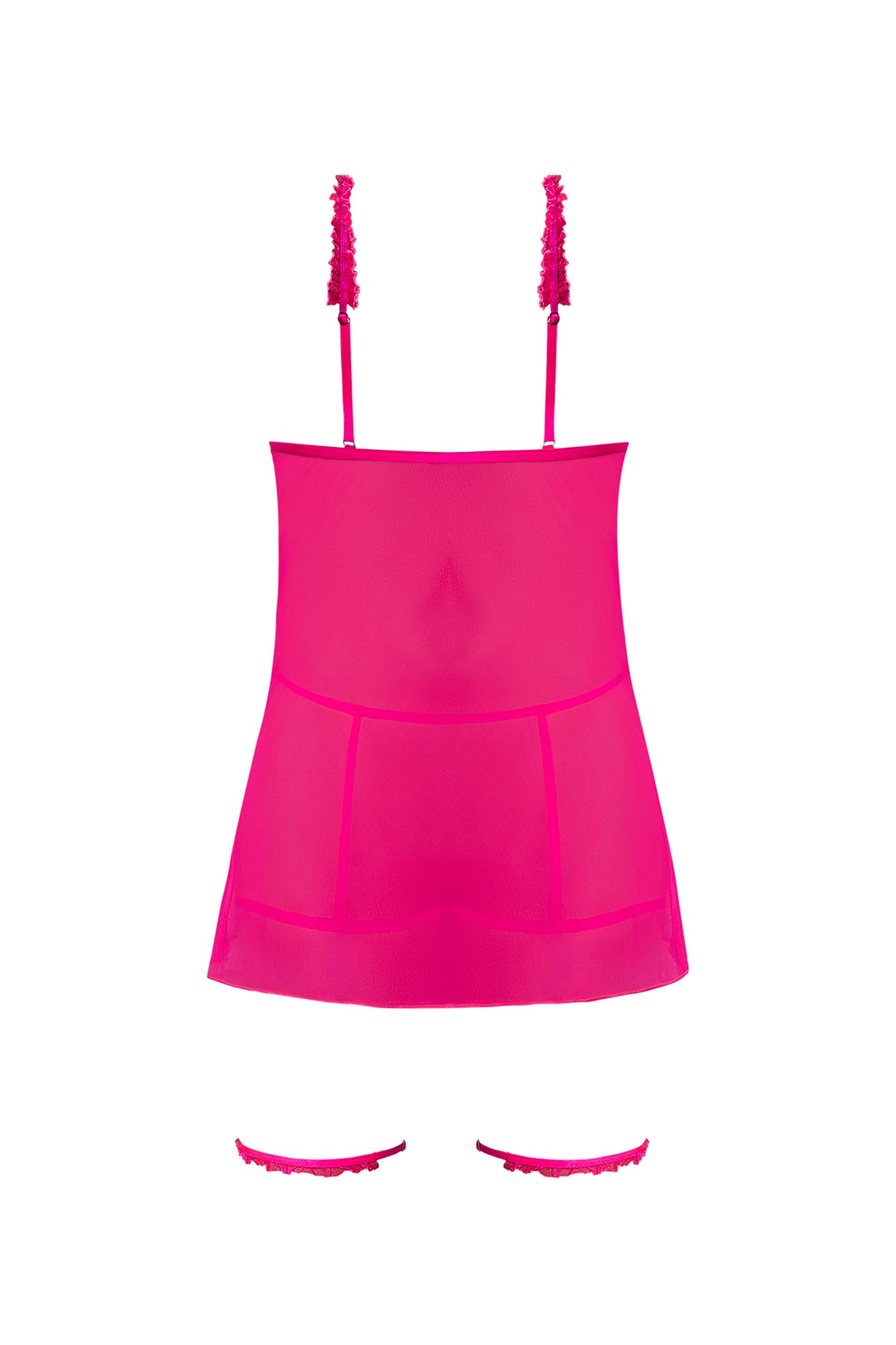 • Turn up the heat with the Pink Kink Cupless Baby Doll, Harness Panty and Removable Garter Cuffs from Magic Silk. Designed for daring allure, this neon pink lingerie set features a soft, stretchy mesh cupless babydoll with flirty ruffle trim, adjustable shoulder straps, and a delicate satin bow. The matching harness panty adds an edgy touch, complete with removable garter thigh cuffs and striking silver-tone hardware for a bold statement. As an added indulgence, each set includes a 15 ml Coochy Cream in Frosted Cake scent. Infused with vanilla, buttercream, and lilac, this luxurious shave cream prevents red bumps while doubling as a nourishing hair conditioner, leaving skin irresistibly smooth.