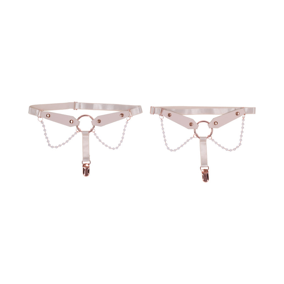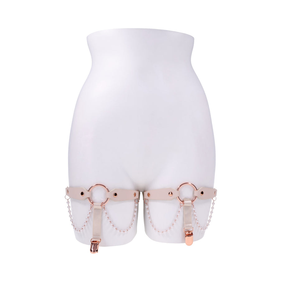 • These luscious Peaches 'N CreaMe Garters are made to turn heads and raise pulses. Crafted from soft faux leather and adorned with delicate pearl strands, a gleaming rose gold O Ring, and functional garter clips, they blend elegance with irresistible edge. Fully adjustable for a perfect fit, they wrap your thighs like a sensual secret, tempting anyone within view to take a closer look or a daring bite. The secure clips hold your thigh highs in place, letting you strut with confidence and command attention at every step. Seduce with style, tease with power, once they catch a glimpse, they'll follow your lead without question.