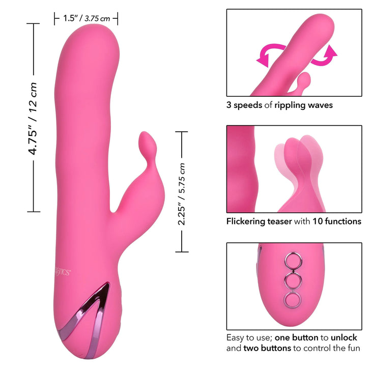 • Powerful massager with rippling waves plus flickering teaser. 3 speeds of rippling waves in the shaft. 10 functions of independent vibration, pulsation and escalation in the stimulator. Body-safe Silicone. State-of-the-art memory chip resumes on last function used. Easy push-button control with security travel lock feature. USB rechargeable – charging cord included.