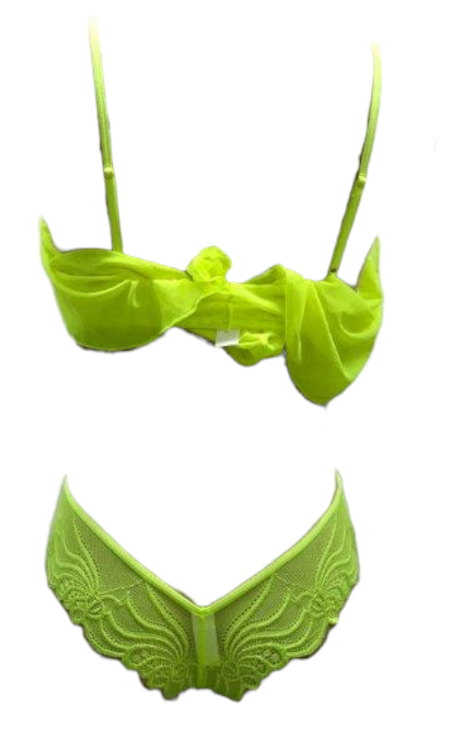 • Neon lace and mesh shorty babydoll with cotton lined g-string. Blacklight reactive!