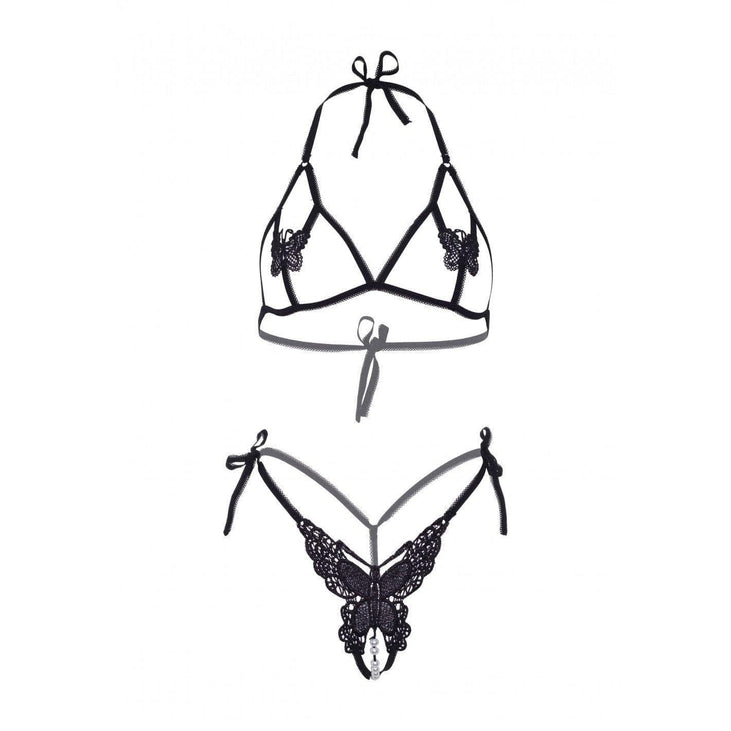Leg Avenue Butterfly Applique Open Cup Bra and Side Tie Pearl Strand Butterfly G-String (2 pieces) - O/S - Black