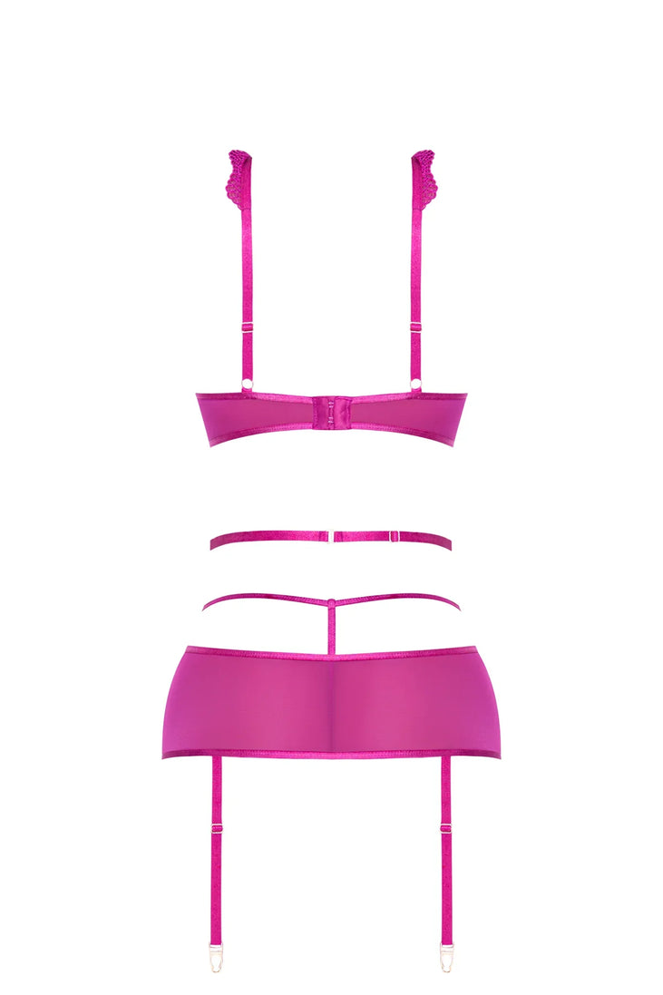 • From the Exposed by Magic Silk collection, this style includes: a lace and mesh cut-out dress featuring adjustable shoulder straps with gold tone sliders, lace cups with underwire and hook and eye closure in the back, an elastic adjustable waist strap with swan hook closure, attached adjustable garters with gold tone sliders, and a matching lace g-string.
