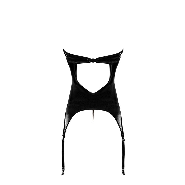 • From the Magic Silk Exposed collection this style includes: Tie Halter Double keyhole merry widow that clips in the back, with attached garters & matching G-string.