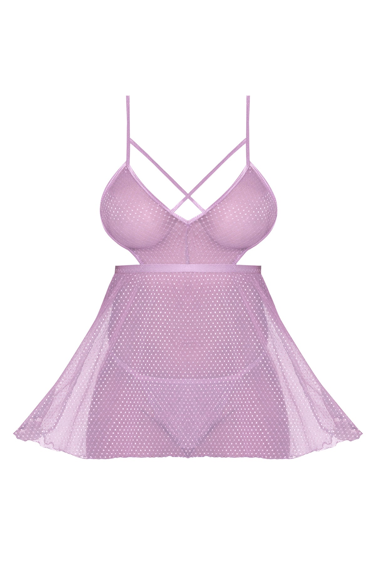 Stretchy yet conforming lilac polka dot mesh complete with frilly ruffle details.