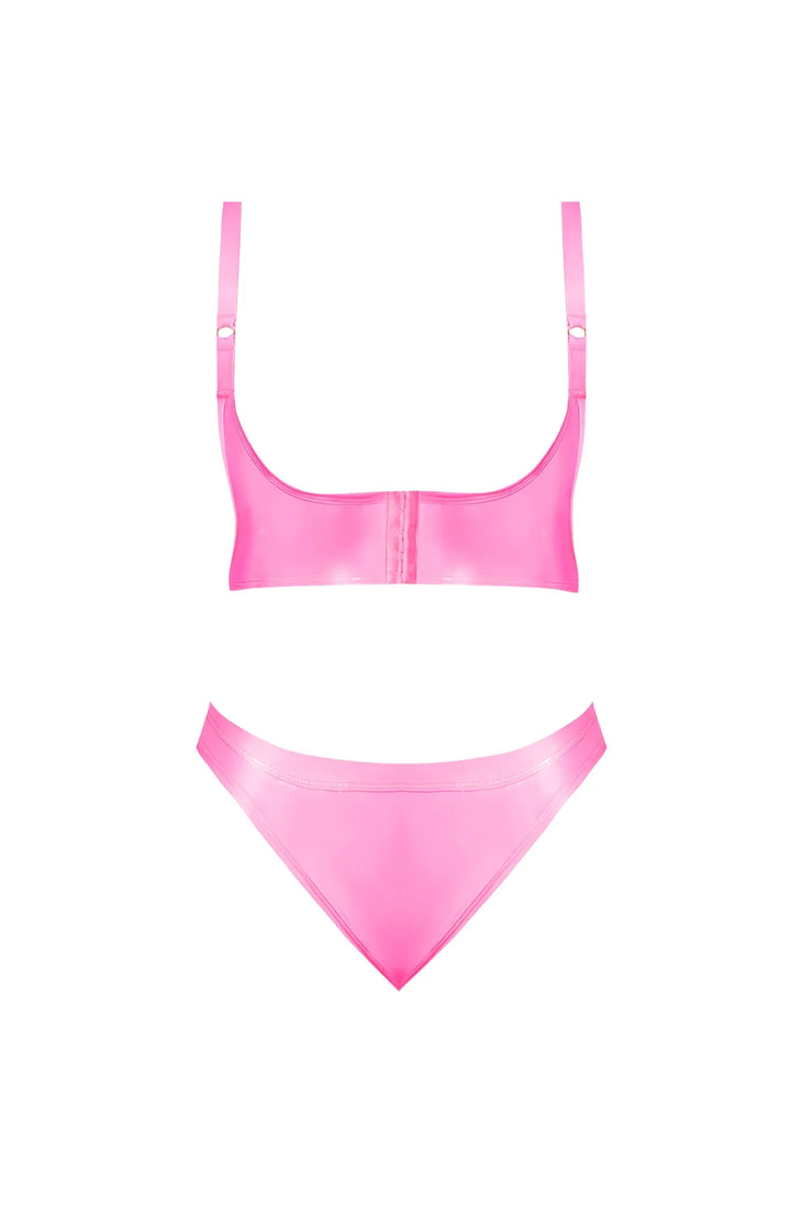 Sweet bubblegum pink meets slick and slippery wet-look fabric.