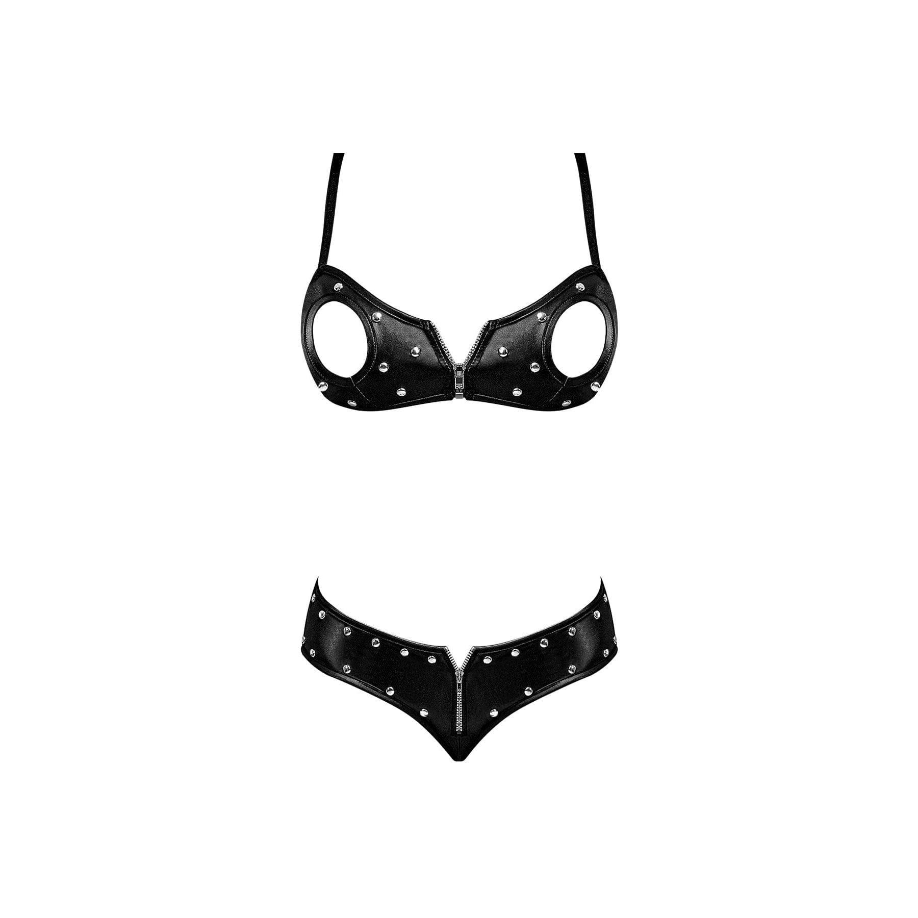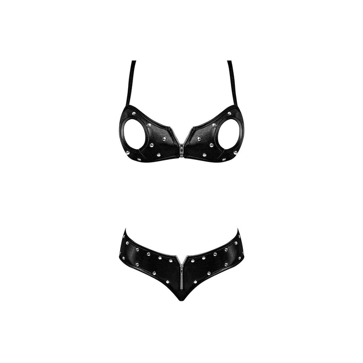 • Supportive bandeau-style peephole bra with adjustable shoulder straps is complemented by matching booty shorts. Both pieces feature metal zippers and a premium leather look. Accessories not included.