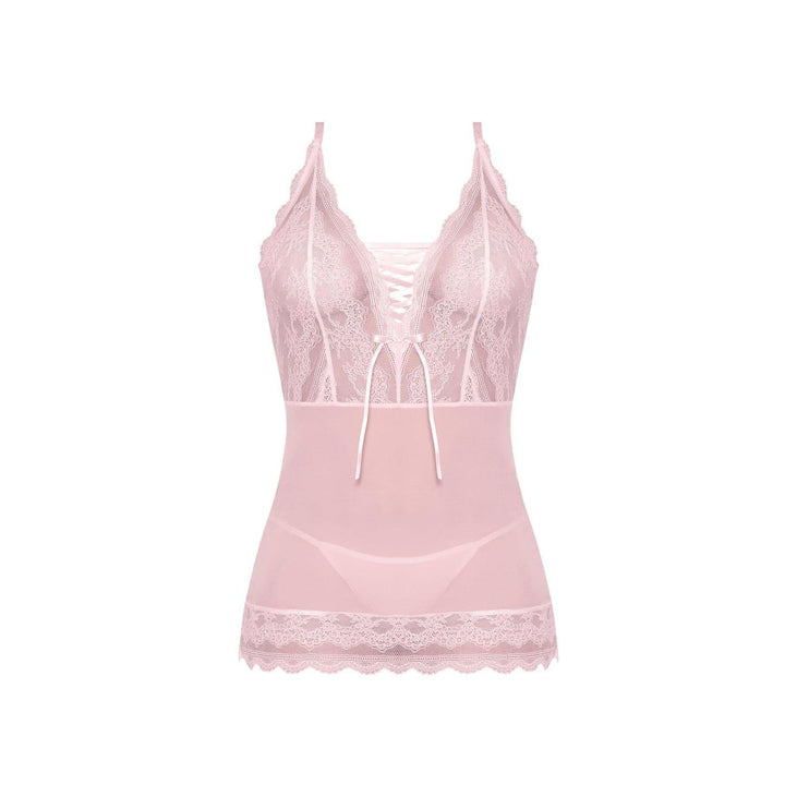 • From the Exposed by Magic Silk collection, this style includes: a flowy, hip length chemise featuring a delicate lace trim hem, functional lace-up ribbon detail at front, adjustable shoulder straps with blush tone sliders, and a matching mesh G-string.