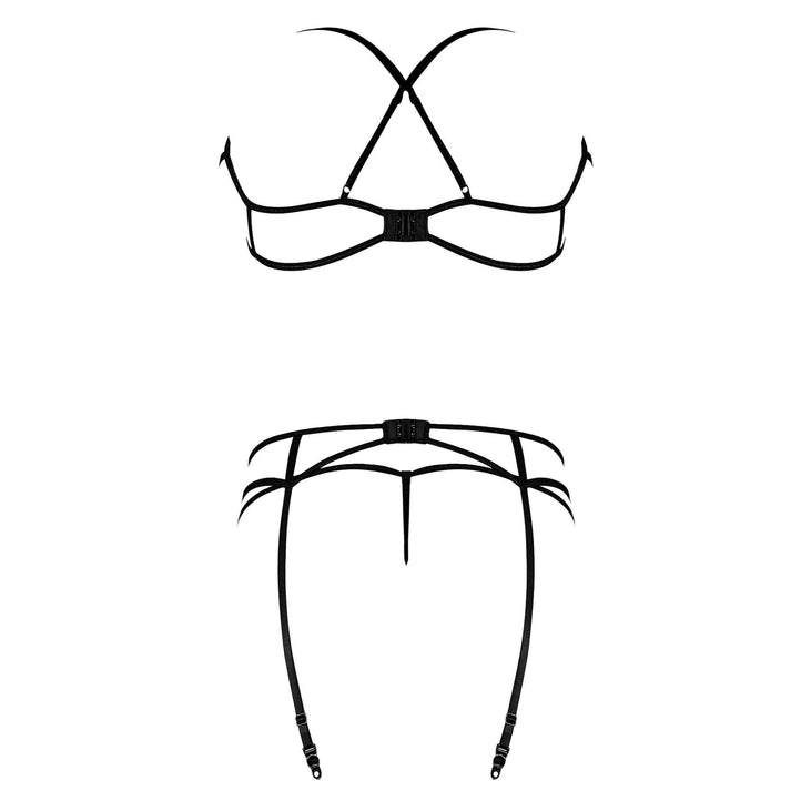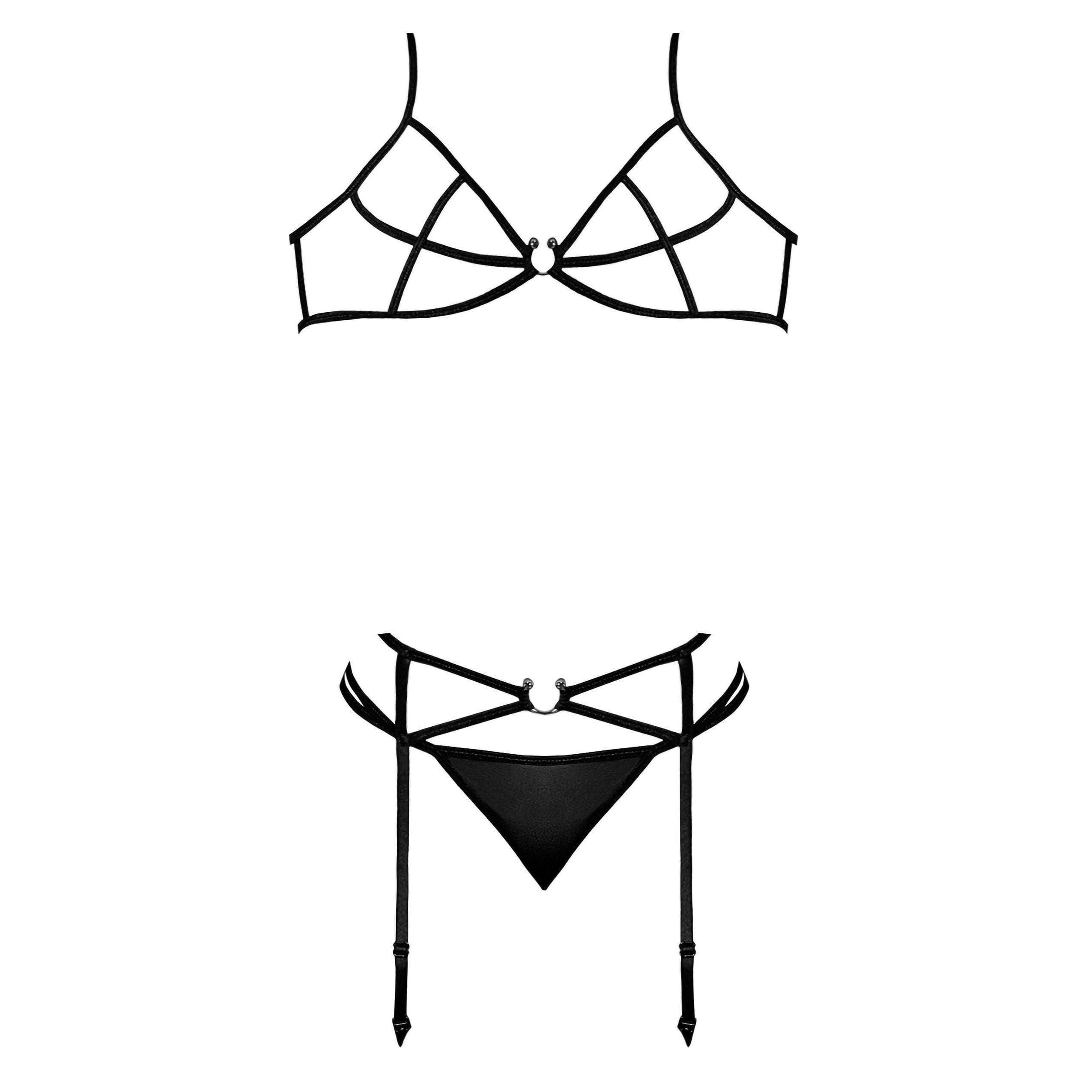 • From the Exposed by Magic Silk collection, this style includes: A strappy bra featuring adjustable shoulder straps that criss cross in the back, a decorative U-ring in front, and hook & eye closure in back. A matching strappy garter featuring a front U-ring accent, hook & eye closure in back, attached adjustable garters with metal clips, and a classic mesh g-string.