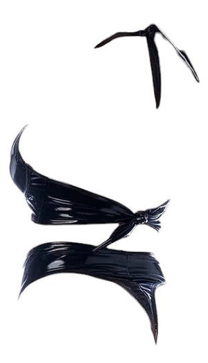 • A daring two-piece set in a vinyl finish that includes crisscross underwire top and high waisted thong with eyelet lace-up details.